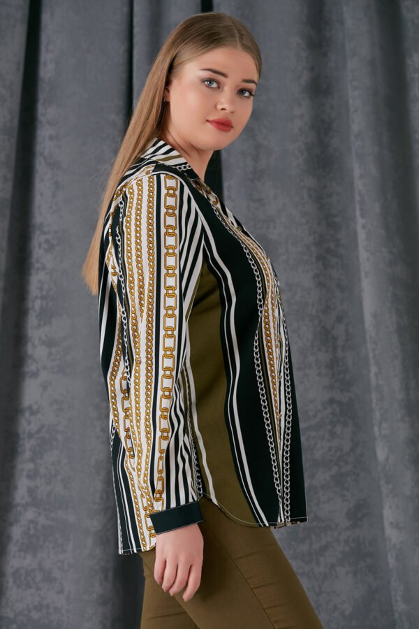 Šie chaki spalvos, didelių dydžių, moteriški, raštuoti marškiniai, susegami priekyje sagomis, su kišene V formos iškirpte bei ilgomis rankovėmis, puikiai tinka tiek laisvalaikiui, tiek į darbą. Šie didelių dydžių moteriški, chaki spalvos raštuoti marškiniai pagaminti iš aukštos kokybės polisterio medžiagos. Prekės dydžių pasirinkimas varijuoja nuo 50 iki 54 dydžio.